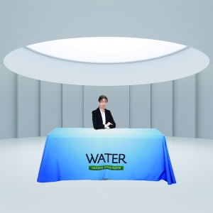 This table skirt, also known as a tablecloth, is printed using a full-color dye-sublimation procedure.Dye-sublimation is a process that is used for 4+ color designs, complex art, photographic images, and instances when exact color matches are needed.