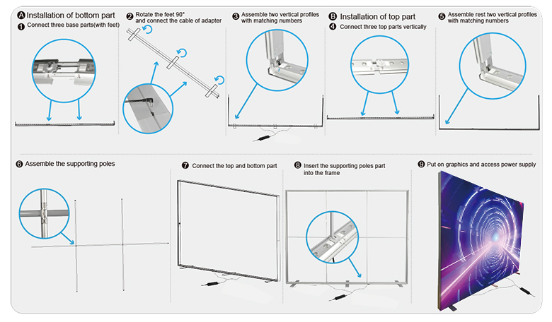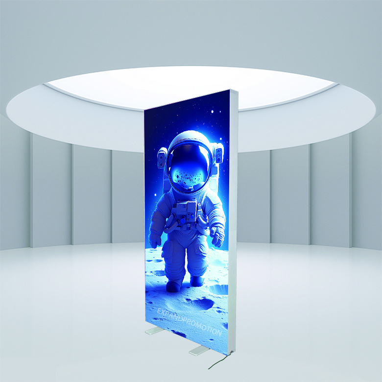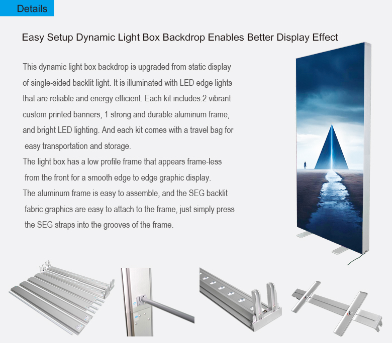Both front and back of the portable SEG fabric backlit wall have a press-fit polyester panel printed with custom graphics.
